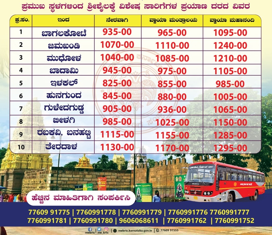 ಹುಬ್ಬಳ್ಳಿ, ಮಾರ್ಚ್ 12: ಚಂದ್ರಮಾನ ಯುಗಾದಿ (Ugadi) ಹಬ್ಬ ಆಚರಣೆಗೆ ಜನರು ಸಿದ್ದತೆಗಳನ್ನು ಮಾಡಿಕೊಳ್ಳುತ್ತಿದ್ದಾರೆ. ಯುಗಾದಿ ಹಬ್ಬದ ನಿಮಿತ್ತ ಉತ್ತರ ಕರ್ನಾಟಕದ ಬಹುತೇಕ ಜಿಲ್ಲೆಯ ಜನರು ಶ್ರೀಶೈಲಂದ (Srisailam) ಶ್ರೀ ಮಲ್ಲಿಕಾರ್ಜುನ ದರ್ಶನಕ್ಕೆ ತೆರಳುತ್ತಾರೆ. ಶ್ರೀಶೈಲಂಗೆ ಹೋಗುವ ಭಕ್ತರ ಅನುಕೂಲಕ್ಕಾಗಿ ವಾಯುವ್ಯ ಕರ್ನಾಟಕ ಸಾರಿಗೆ ಸಂಸ್ಥೆ (NWKRTC) ಶ್ರೀಶೈಲಂಕ್ಕೆ ಉತ್ತರ ಕರ್ನಾಟಕದ ವಿವಿಧ ತಾಲೂಕು ಕೇಂದ್ರಗಳಿಂದ ಬಸ್ಗಳನ್ನು ಬಿಟ್ಟಿದೆ. ಹಬ್ಬದ ಸಂದರ್ಭದಲ್ಲಿ ಹೆಚ್ಚಿನ ಸಂಖ್ಯೆಯಲ್ಲಿ ಭಕ್ತರು ಭೇಟಿ ನೀಡುವ ಹಿನ್ನೆಲೆಯಲ್ಲಿ ವಿಶೇಷ ಬಸ್ಗಳನ್ನು ಬಿಟ್ಟಿದ್ದು, ಜೊತೆಗೆ ಟಿಕೆಟ್ ದರ, ಬಸ್ ಮಾರ್ಗ ಹಾಗೂ ವೇಳಾಪಟ್ಟಿ ವಿವರಗಳನ್ನು ನಿಗಮ ಪ್ರಕಟಿಸಿದೆ. ಹಾಗಿದ್ದರೆ, ಯಾವ್ಯಾವ ತಾಲೂಕುಗಳಿಂದ ಶ್ರೀಶೈಲಂಗೆ ವಿಶೇಷ ಬಸ್ಗಳನ್ನು ಬಿಡಲಾಗಿದೆ? ಬುಕ್ಕಿಂಗ್ ಸಮಯ ಏನು? ಬಸ್ ಸಂಚಾರ ಮಾರ್ಗ ಸಂಪೂರ್ಣ ವಿವರ ಇಲ್ಲಿದೆ. ಅಥಣಿ- ವೆಂಕಟಾಪುರ-ಶ್ರೀಶೈಲಂ ಅಥಣಿ- ವೆಂಕಟಾಪುರ-ಶ್ರೀಶೈಲಂಗೆ ಮಾರ್ಚ್ 18ರವರೆಗೆ ಮೂರು ವಿಶೇಷ ವೇಗದೂತ ಬಸ್ಗಳು ಸಂಚರಿಸಲಿವೆ. ಅಥಣಿಯಿಂದ ಶ್ರೀಶೈಲಂಗೆ ಬೆಳಗ್ಗೆ10:30, ಮಧ್ಯಾಹ್ನ 2:30 ಮತ್ತು ಸಂಜೆ 5:30ಕ್ಕೆ ಬಸ್ಗಳು ತೆರಳುತ್ತವೆ. ಈ ಬಸ್ಸುಗಳು ವ್ಹಾಯಾ ವಿಜಯಪುರ ಮತ್ತು ಆತ್ಮಕುರಂ ಮಾರ್ಗವಾಗಿ ಶ್ರೀಶೈಲಂ ತಲಪುತ್ತವೆ. ಇನ್ನು ಹಿಂತಿರುಗುವ ದಿಕ್ಕಿನಲ್ಲಿ, ಶ್ರೀಶೈಲಂನಿಂದ ಅಥಣಿಗೆ ವಿಶೇಷ ಬಸ್ ಬಿಡಲಾಗಿದೆ. ಈ ಬಸ್ ವ್ಹಾಯಾ ಮೆಹಬೂಬ್ ನಗರ ಮಾರ್ಗವಾಗಿ ಅಥಣಿ ತಲಪುತ್ತದೆ. ಅಥಣಿಯಿಂದ ಶ್ರೀಶೈಲಂಗೆ ಬಸ್ ಟಿಕೆಟ್ ದರ 1110 ರೂ., ವೆಂಕಟಾಪುರಗೆ 875 ರೂ. ನಿಗದಿಪಡಿಸಲಾಗಿದೆ. ಇನ್ನು, ಶ್ರೀಶೈಲಂನಿಂದ ಅಥಣಿಗೆ 1010 ರೂ. ಪ್ರಯಾಣ ದರ ನಿಗದಿಪಡಿಸಲಾಗಿದೆ. ಆನ್ಲೈನ್ನಲ್ಲಿ WWW.ksrtc.in ಟಿಕೆಟ್ ಬುಕ್ಕಿಂಗ್ ಮಾಡುವ ಅವಕಾಶವಿದೆ. ಬಾಗಲಕೋಟೆ-ಶ್ರೀಶೈಲಂ ಬಾಗಲಕೋಟೆ ವಿಭಾಗದ ಎಲ್ಲ ತಾಲೂಕು ಬಸ್ ನಿಲ್ದಾಣಗಳಿಂದ ಶ್ರೀಶೈಲಂಗೆ ವಿಶೇಷ ಬಸ್ಗಳನ್ನು ಬಿಡಲಾಗಿದೆ. ಬಾಗಲಕೋಟೆ, ಜಮಖಂಡಿ, ಮುಧೋಳ, ಬದಾಮಿ, ಇಳಕಲ್, ಹುನಗುಂದ, ಗುಳೇದಗುಡ್ಡ, ಬೀಳಗಿ, ರಬಕವಿ, ಬನಹಟ್ಟಿ ಮತ್ತು ತೇರದಾಳ ಬಸ್ ನಿಲ್ದಾಣಗಳಿಂದ ವಿಶೇಷ ಬಸ್ಗಳನ್ನು ಬಿಡಲಾಗಿದೆ. ಆಯಾ ತಾಲೂಕಿನಿಂದ ಹೊರಡುವ ಬಸ್ಗಳ ಟಿಕೆಟ್ ದರದಲ್ಲಿ ವ್ಯತ್ಯಾಸವಿದೆ. ಏಕೆಂದರೆ, ಕಿಲೋಮಿಟರ್ಗಳ ವ್ಯತ್ಯಾಸದಿಂದ ಟಿಕೆಟ್ ದರ ಬೇರೆಯಾಗಿದೆ. ಟಿಕೆಟ್ ದರ ಬಾಗಲಕೋಟೆ ವಿಭಾಗದಿಂದ ಯಾತ್ರಾರ್ಥಿಗಳಿಗೆ ವಿಶೇಷ ಸೌಲಭ್ಯ • ಸಮೀಪದ ಘಟಕದಿಂದ ಬಸ್ಸುಗಳನ್ನು ಒದಗಿಸಲಾಗಿದೆ.• ಎಲ್ಲಾ ಘಟಕಗಳಲ್ಲಿ ಮುಂಗಡ ಬುಕ್ಕಿಂಗ್ ವ್ಯವಸ್ಥೆ ಕಲ್ಪಿಸಲಾಗಿದೆ.• ಒಂದೇ ಗುಂಪಿನಲ್ಲಿ ಪ್ರಯಾಣಿಸುವ ಕನಿಷ್ಠ 50 ಜನ ಪ್ರಯಾಣಿಕರಿದ್ದಲ್ಲಿ ಹೋಗುವ ಹಾಗೂ ಮರಳಿ ಬರುವಾಗ ನೇರವಾಗಿ ತಮ್ಮ ಊರುಗಳಿಗೆ ಬಸ್ಸುಗಳನ್ನು ಬಿಡಲಾಗುತ್ತದೆ.• ಯಾತ್ರಾರ್ಥಿಗಳು ಇಚ್ಛಿಸಿದಲ್ಲಿ ಮಹಾನಂದಿ, ಮಂತ್ರಾಲಯ ಹಾಗೂ ಇತರೆ ಯಾತ್ರಾ ಸ್ಥಳಗಳಿಗೆ ದರ್ಶನ ಸೌಲಭ್ಯ ಕಲ್ಪಿಸಲಾಗುತ್ತದೆ.• ಮಾರ್ಗದ ಮಧ್ಯದಲ್ಲಿರುವ ಉಚಿತ ಅನ್ನ ಸಂತರ್ಪಣೆ ಸ್ಥಳಗಳಲ್ಲಿ ಊಟಕ್ಕಾಗಿ ಕಾಲಾವಕಾಶ ನೀಡಲಾಗುತ್ತದೆ. ಇದನ್ನೂ ಓದಿ: ಹುಬ್ಬಳ್ಳಿ, ಬೆಂಗಳೂರು, ಕಲಬುರಗಿಯಿಂದ ಹೊರಡುವ ವಂದೇ ಭಾರತ್ ರೈಲುಗಳ ವೇಳಾಪಟ್ಟಿ ಪರಿಷ್ಕರಣೆ ಗೋಕಾಕ- ವೆಂಕಟಾಪುರ-ಶ್ರೀಶೈಲಂ ಗೋಕಾಕ- ವೆಂಕಟಾಪುರ-ಶ್ರೀಶೈಲಂಗೆ ಮಾರ್ಚ್ 15ರವರೆಗೆ ಎರಡು ವಿಶೇಷ ವೇಗದೂತ ಬಸ್ಗಳು ಸಂಚ